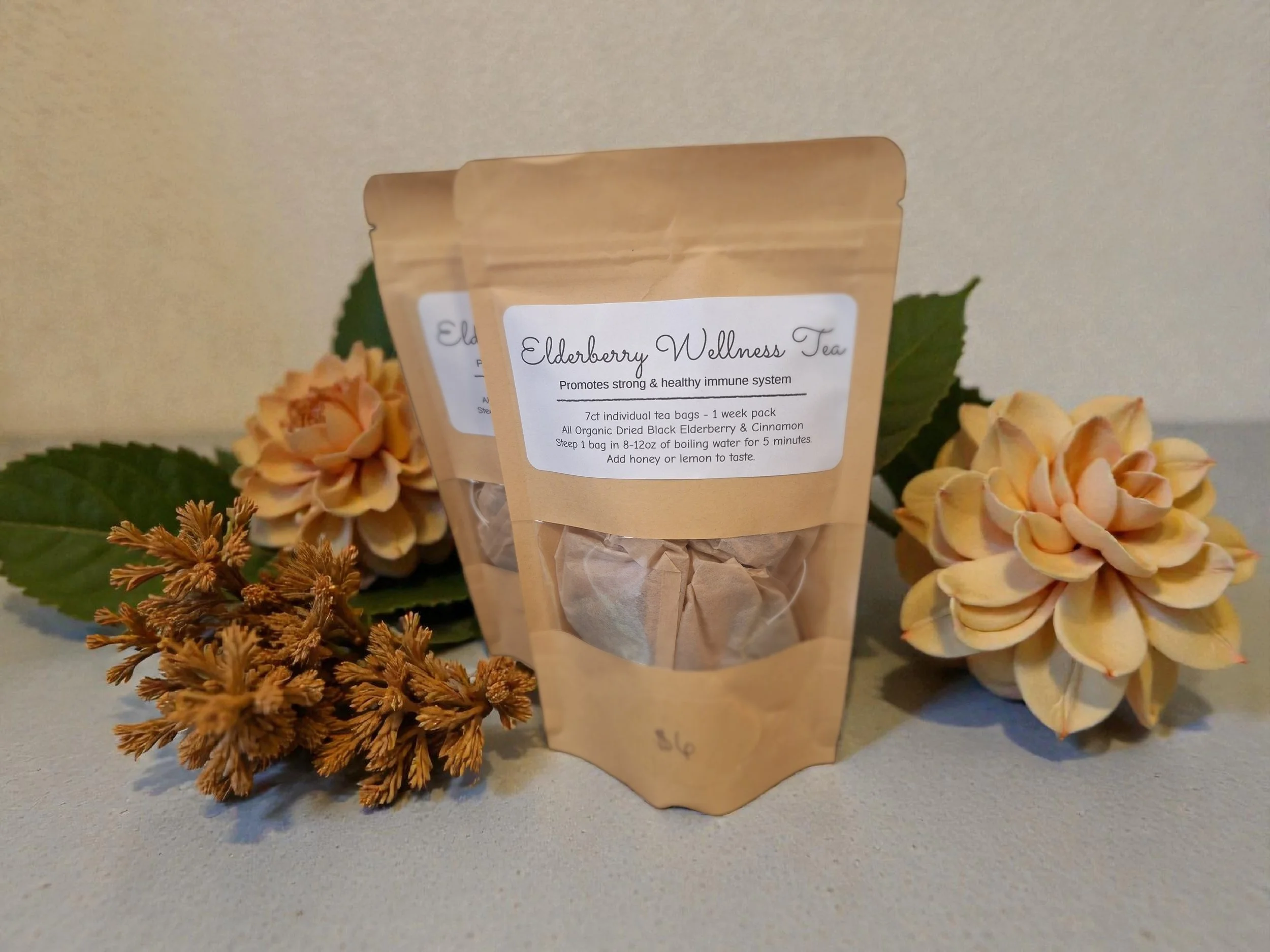 Crafted here on our Farmstead, our Elderberry Wellness Tea is made in small batches using organic dried elderberries and a touch of cinnamon in each biodegradable tea bag. Each pack includes 7 tea bags, one for each day of the week, making it easy to enjoy a simple daily tea ritual.