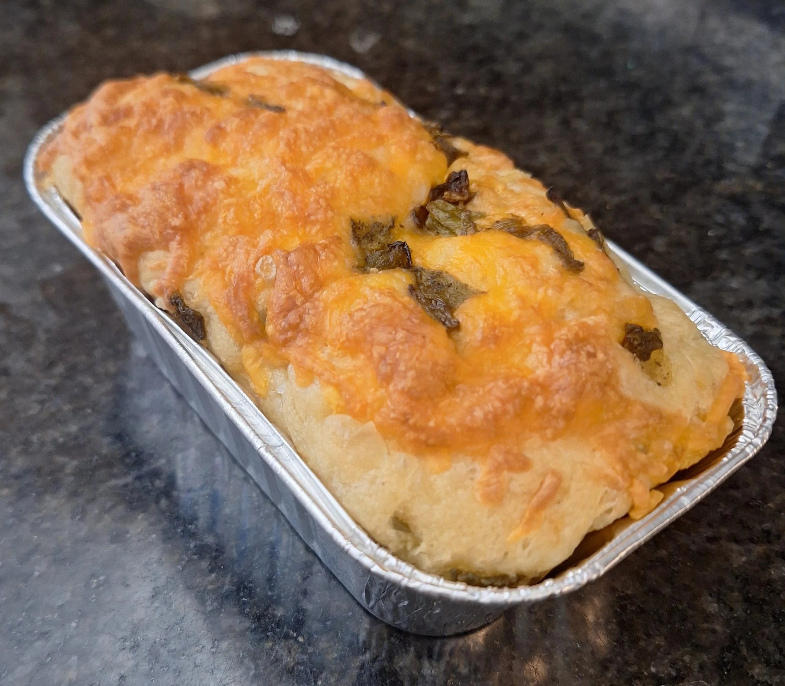 Individual mini focaccia loaf baked with roasted Hatch green chiles and a blend of Monterey Jack, cheddar, and asadero cheeses. Soft and savory with a lightly crisp exterior.
